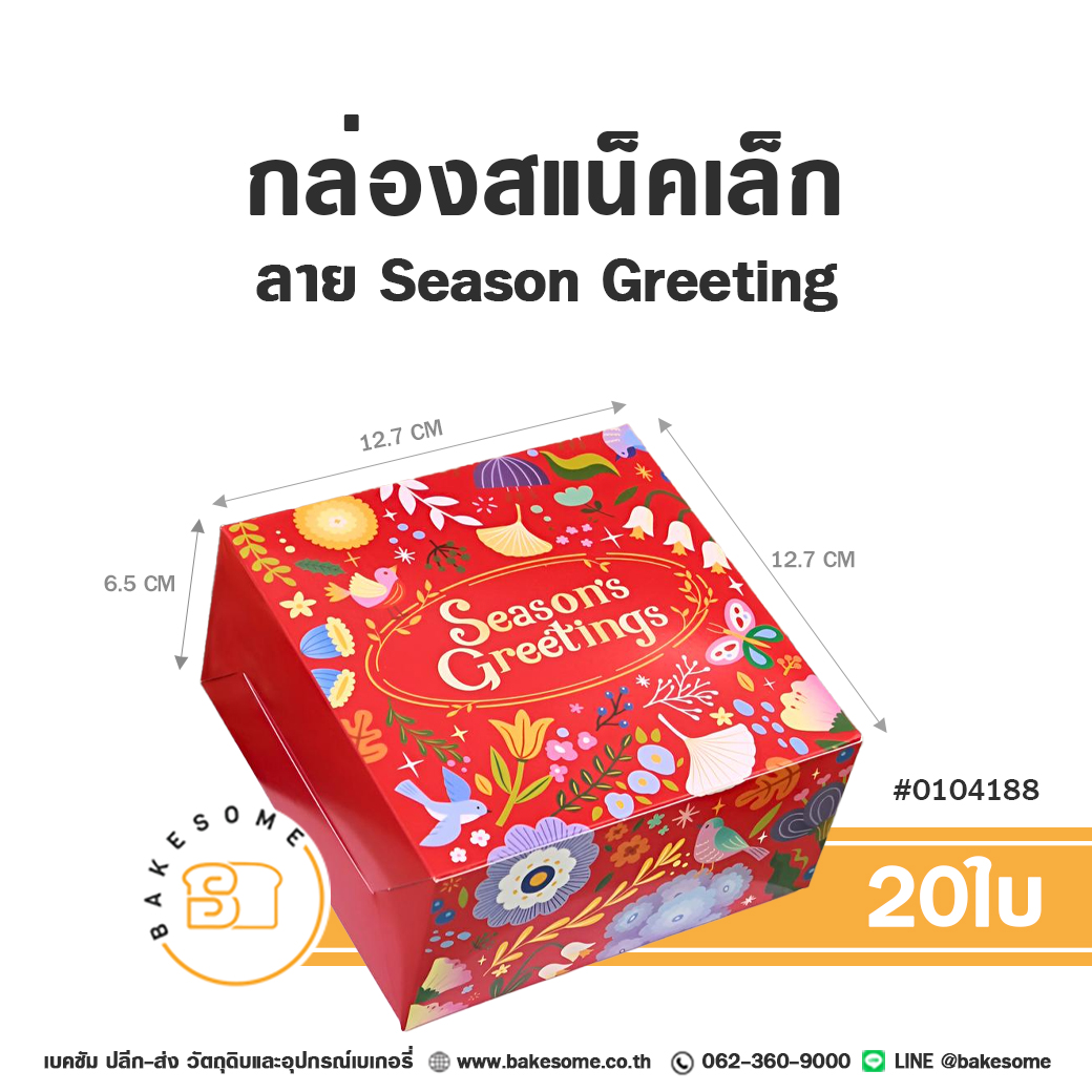 กล่องสแน็คเล็ก ลาย Season’s Greeting ขนาด กว้าง 12.7 x ยาว 12.7 x สูง 6.5 ซม. แพ็คละ 20 ใบ เหมาะสำหรับใช้ใส่ ขนม เบเกอรี่ ของว่าง หรือเซ็ตเบรก ในงานประชุม สัมมนา งานเลี้ยงต้อนรับ หรือมอบเป็นของฝากสุดประทับใจ