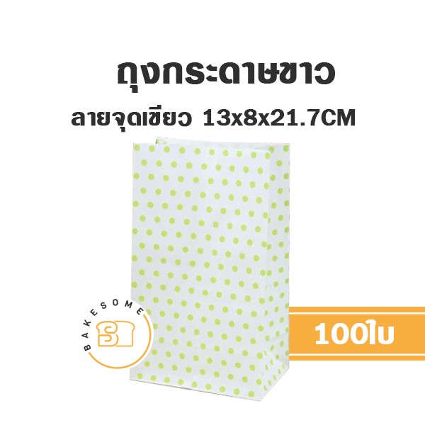 ถุงกระดาษใส่ขนม สีขาว ลายจุดเขียว 13x8x21.7 (100ใบ)