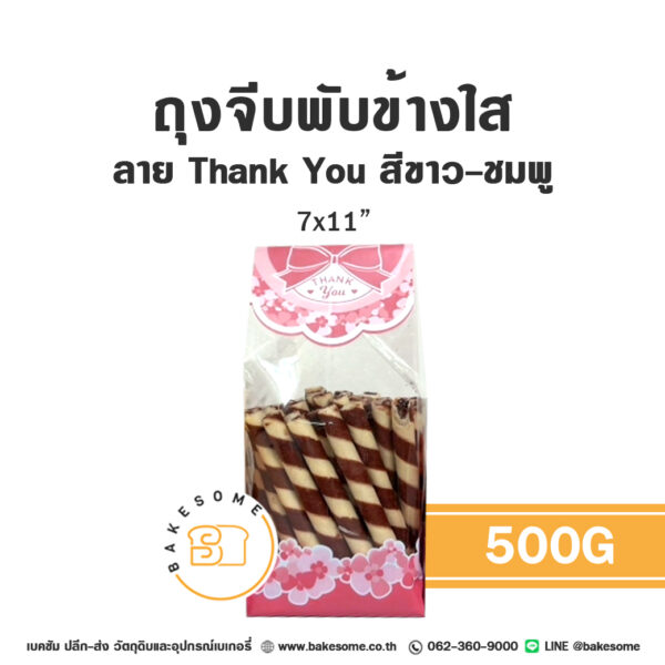 ถุงจีบพับข้างใส ลาย Thank You สีขาวชมพู 7×11″ 500G