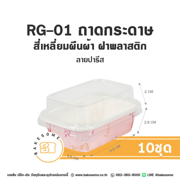 RG-01 ถาดกระดาษสี่เหลี่ยมผืนผ้า ฝาพลาสติก ลายปารีส (Paris) (10 ชุด) คือบรรจุภัณฑ์ขนมที่ออกแบบมาเพื่อสร้างความประทับใจด้วยลวดลาย “Paris” ที่มีเสน่ห์อ่อนหวาน เหมาะอย่างยิ่งสำหรับการบรรจุขนมทรงยาว เช่น เค้กโรลชิ้นเล็ก, บราวนี่สติ๊ก, หรือ มาการองที่จัดเรียง โดยมอบลุคที่ น่ารัก โรแมนติก และมีสไตล์ ไม่ซ้ำใคร